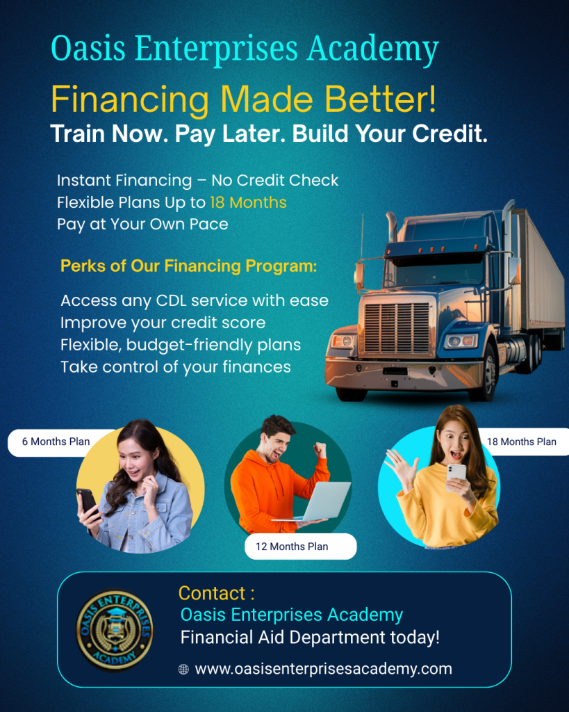 At Oasis Enterprises Academy, you can begin CDL training immediately with Denefits, our no-credit-check financing partner. No denials. No hard inquiries. Just fast approval and affordable payments.