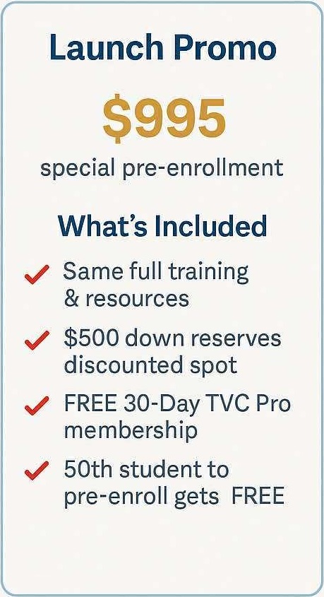 That’s our limited Launch Promo. Pre-enrollment is $500 down toward the $995 tuition, and you get the same full training and resources. The 50th student enrolled gets the course FREE. After the first 50 seats are filled, regular tuition applies ($1,995 out-of-pocket or $2,495 financed).