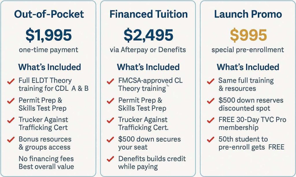 📘 Bonus Resources: Student Welcome Packet, Behind-the-Wheel School Selection Guide, Execution Commitment Statement, and Career Launch eBooks.
